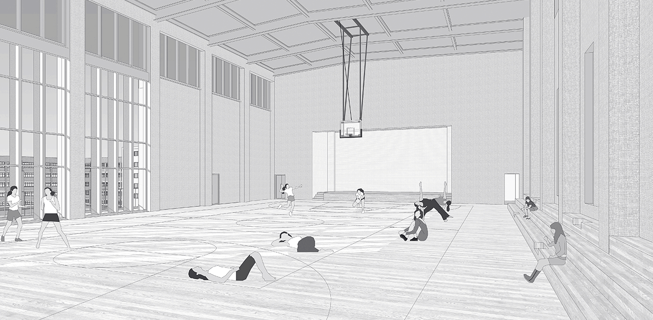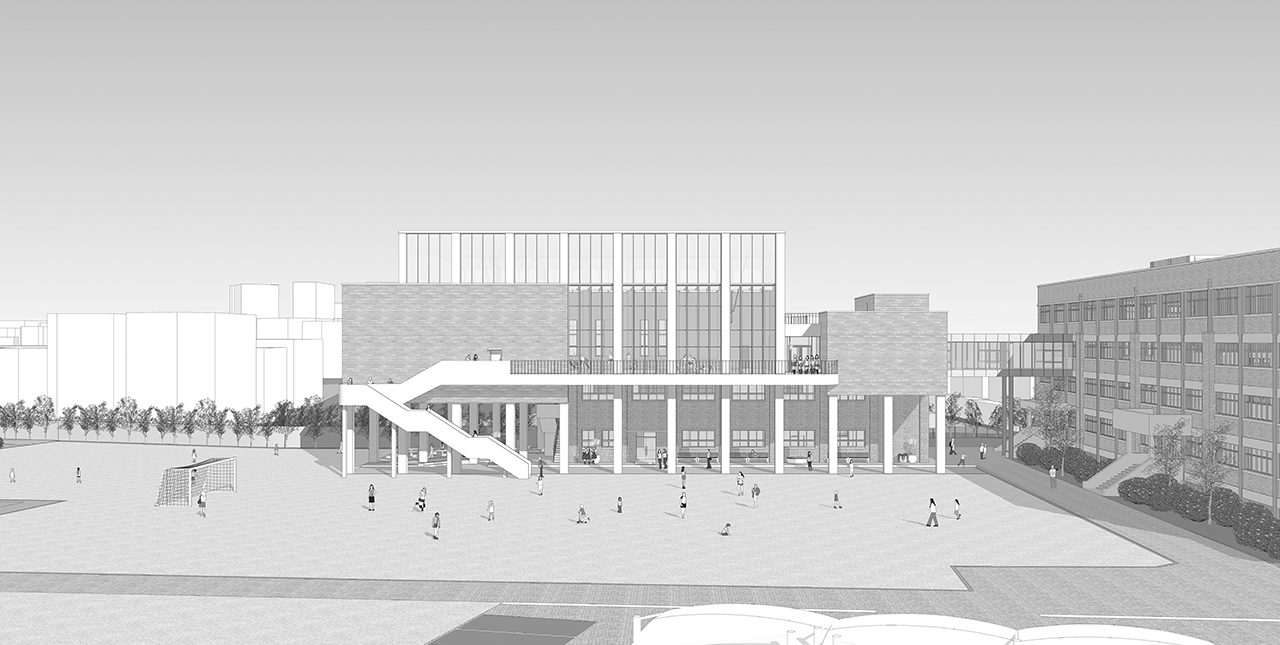 기존 급식동 상부에 증축되는 체육관. 운동장, 필로티, 체육관이 효율적으로 연결되도록 동선과 내외부 공간을 계획한다.