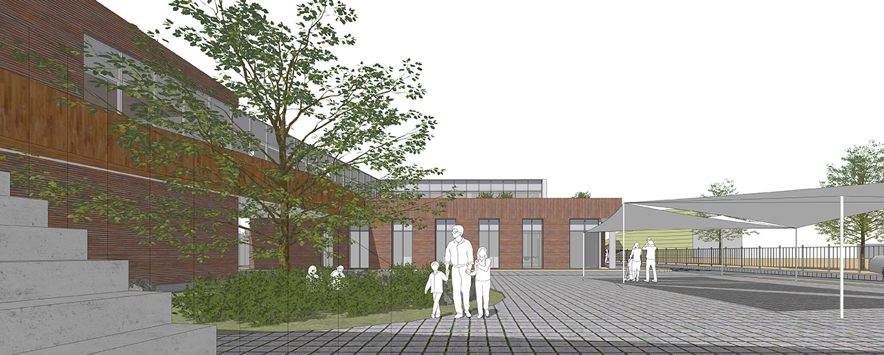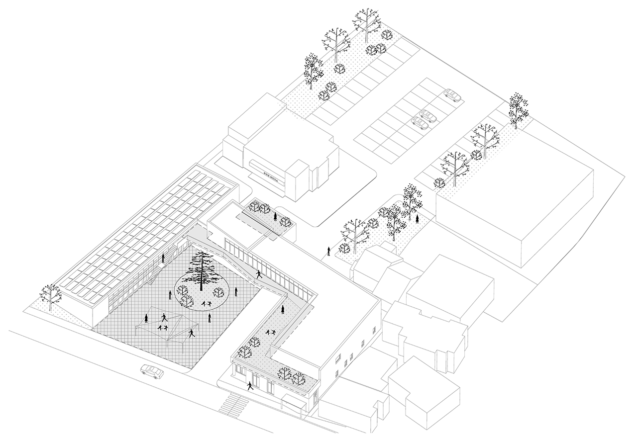전면도로에서 보호수목이 있는 마당과 이어지고 마당에서 프로그램을 직접 연결한다.